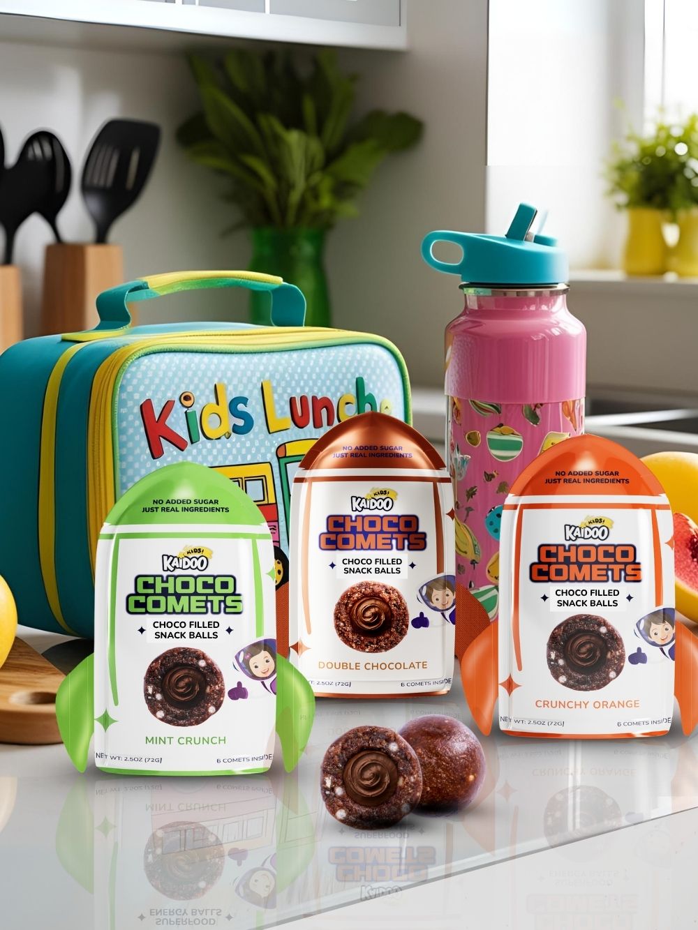 A variety pack of 3 flavours of Choco Comets. The top selling Double Chocolate, the yummy Crunchy Orange and refreshing Mint Crunch! These chocolate-filled bites are made with wholesome ingredients, no added sugar, and no preservatives. Packed in a fun rocket pouchβperfect for snack time adventures!