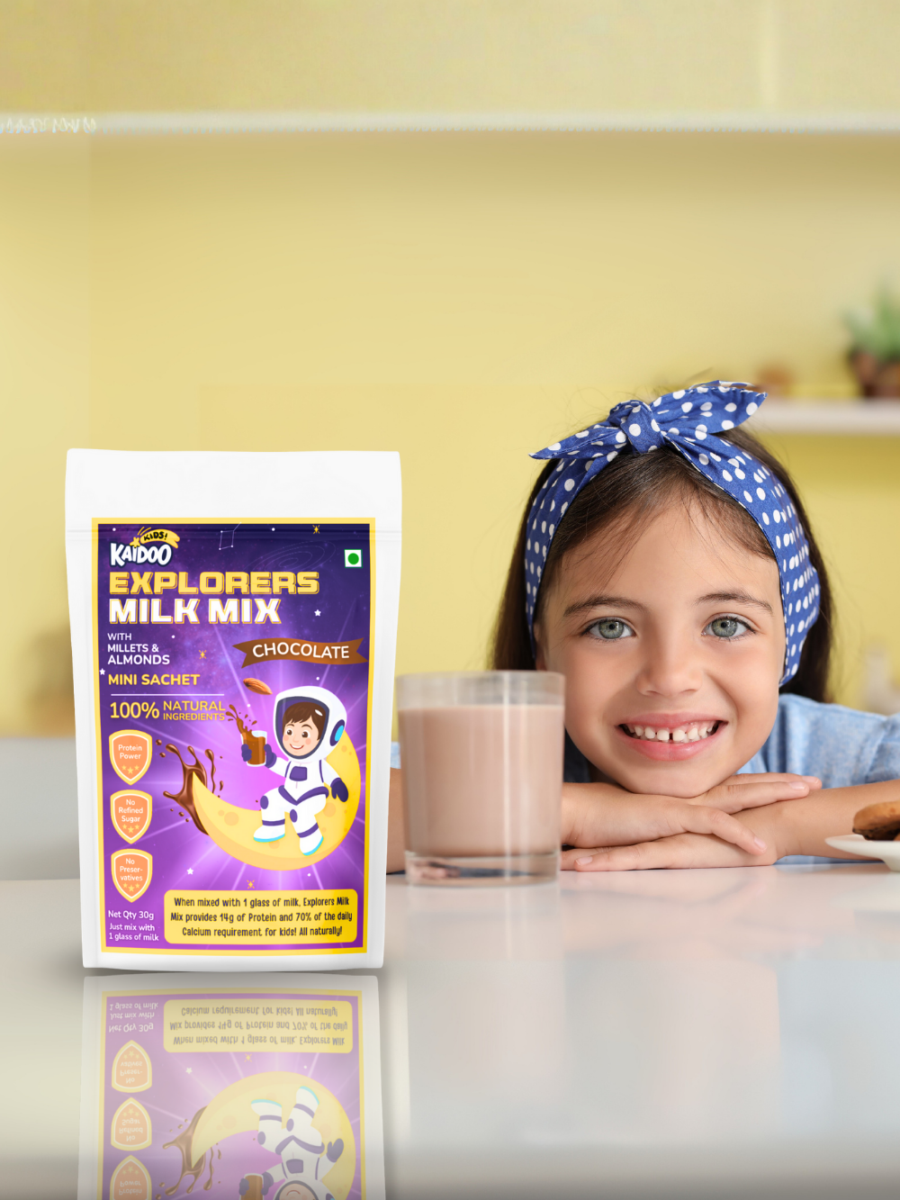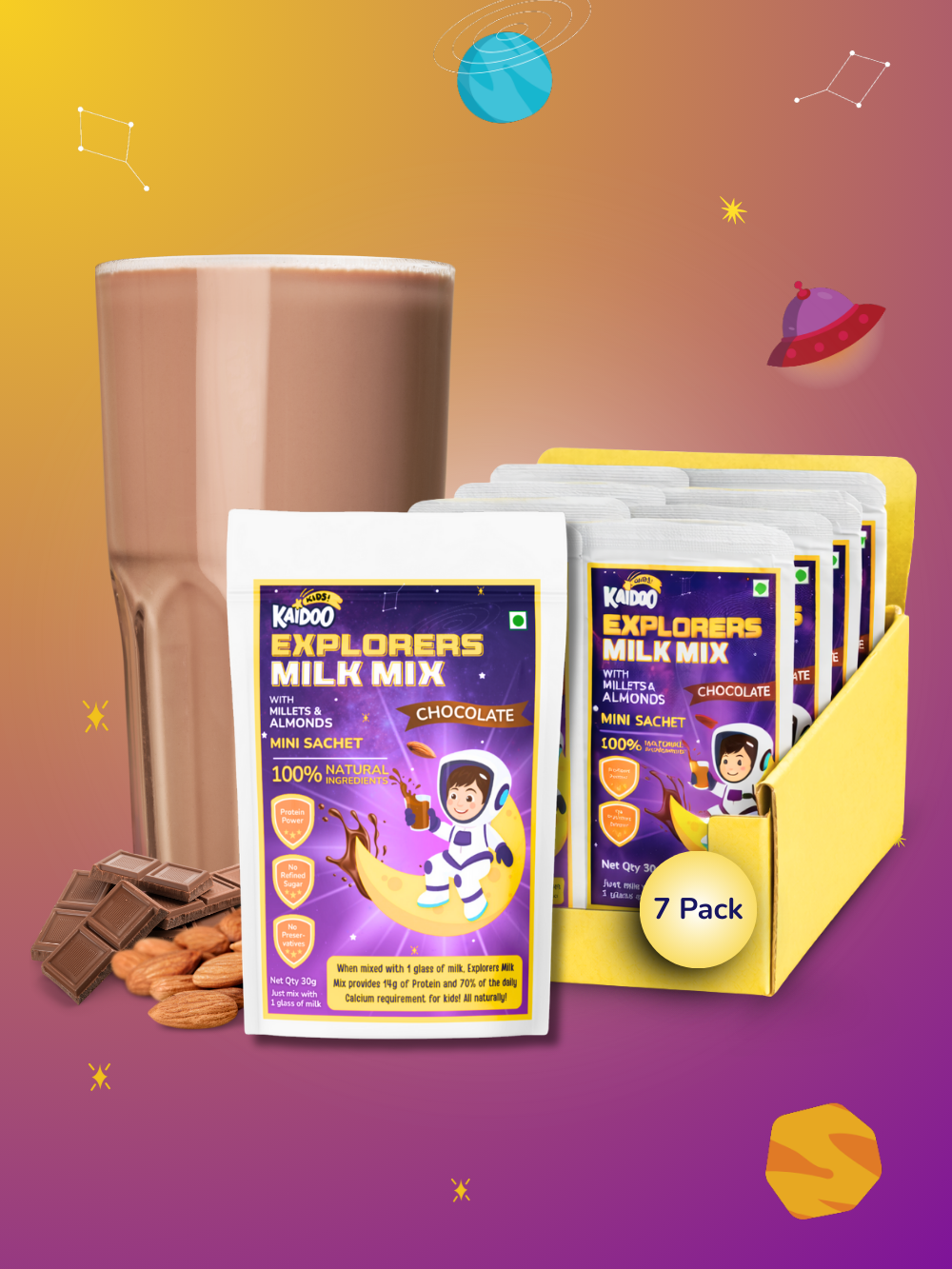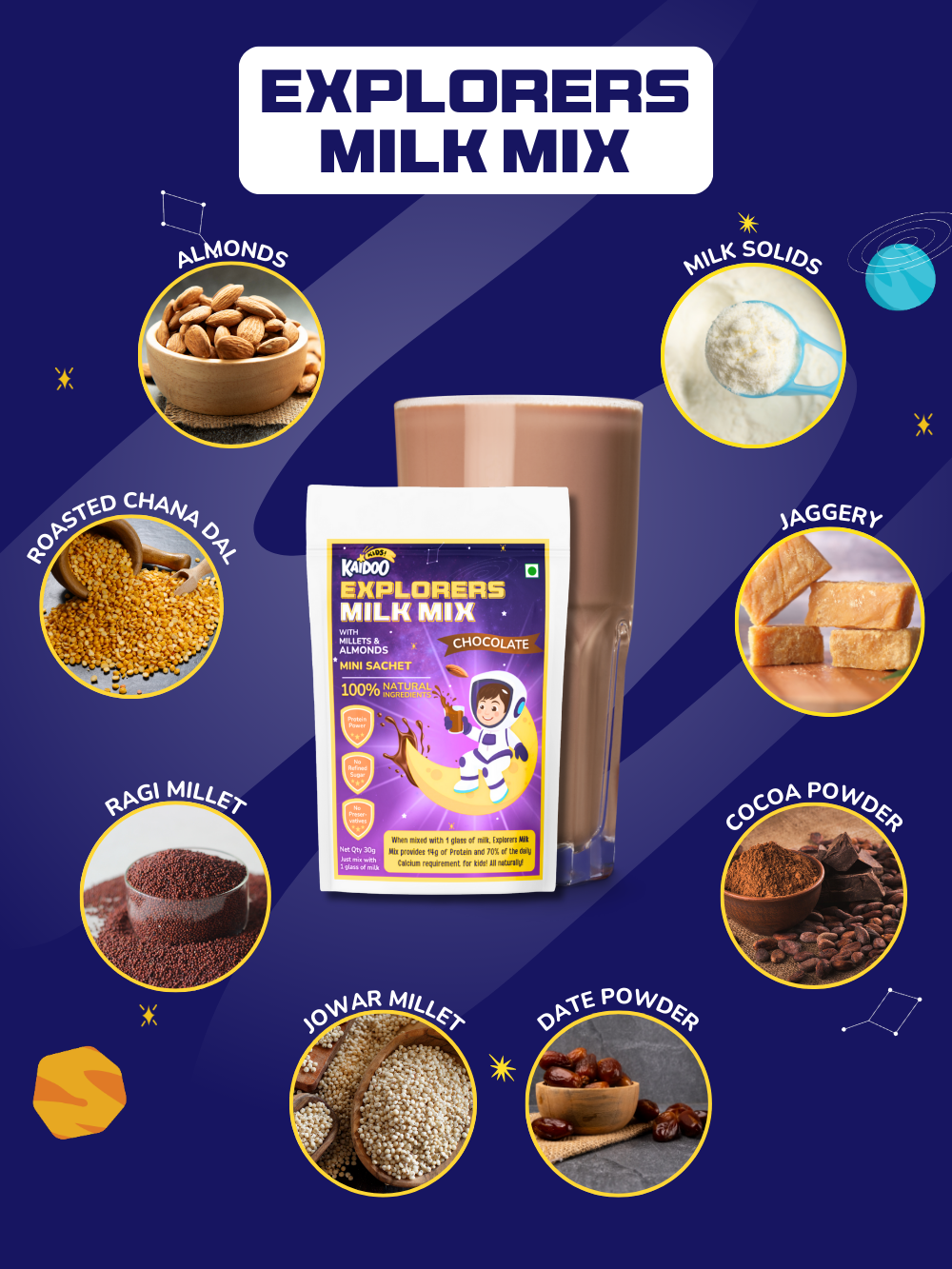 7 Sachet Trial Box for Explorers Milk Mix - use for 1 week and see if you child likes it before buying the Jar! A nourishing milk mix powder made with natural, wholesome ingredients for growing minds and bodies. Rich in protein and essential nutrients, itβs a tasty way to power up milk either at breakfast or after dinner. No refined sugar, no preservatives, no added artificial supplements, no premix of vitamins & minerals - only natural ingredients.