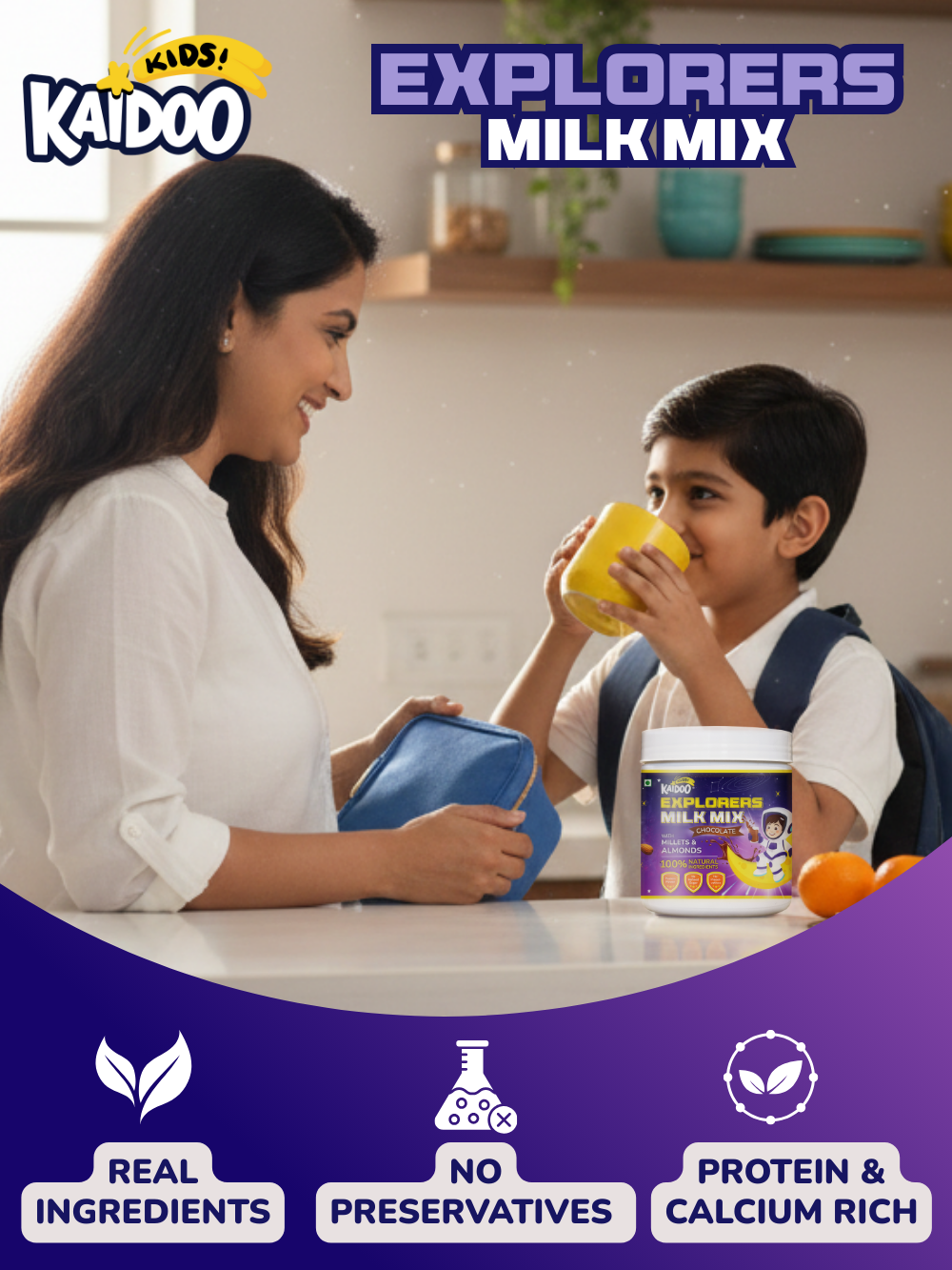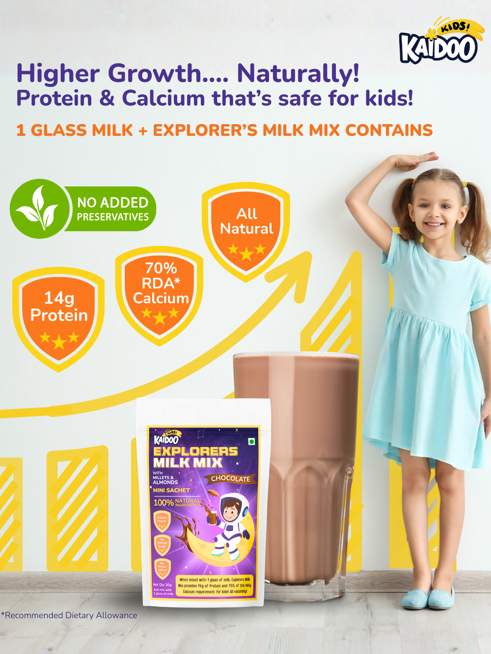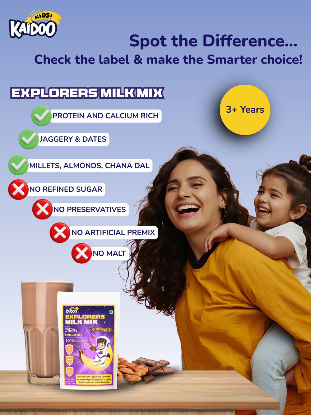 7 Sachet Trial Box for Explorers Milk Mix - use for 1 week and see if you child likes it before buying the Jar! A nourishing milk mix powder made with natural, wholesome ingredients for growing minds and bodies. Rich in protein and essential nutrients, itβs a tasty way to power up milk either at breakfast or after dinner. No refined sugar, no preservatives, no added artificial supplements, no premix of vitamins & minerals - only natural ingredients.